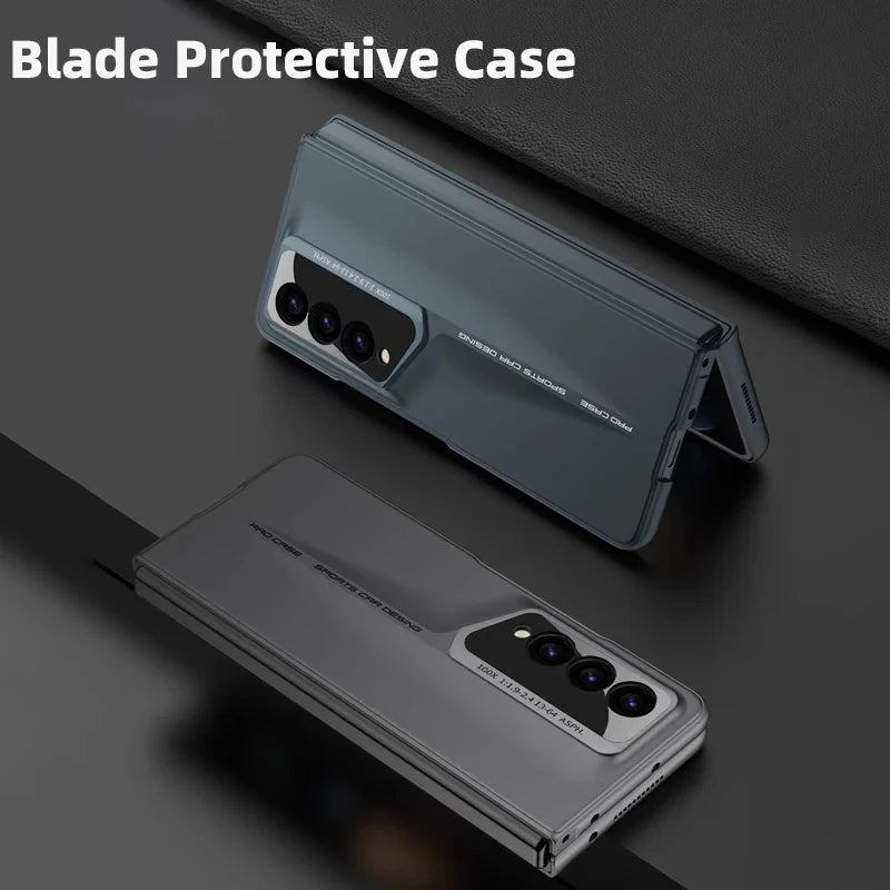 "Introducing our Blade Ultra-thin Case, the ultimate fusion of style and protection for your Samsung Galaxy Z Fold 5 & Fold 4. Crafted with an integrated hard shell and screen film, this case offers unparalleled defense against drops and scratches. Its ultra-thin design ensures a comfortable grip while maintaining the sleek profile of your device. Say goodbye to bulky cases and hello to effortless protection with Blade."